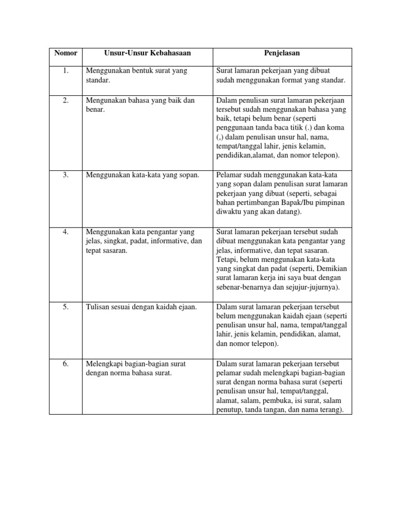 Demikian surat lamaran pekerjaan ini saya buat. Peserta didik diminta untuk membandingkan unsur kebahasaan surat lamaran pekerjaan. Padahal, ada banyak hal yang harus kamu perhatikan. Bahasa pada bagian isi surat juga menggunakan kata pengantar yang singkat, padat, jelas, dan formal. Unsur kebahasaan surat lamaran pekerjaan alokasi waktu :
